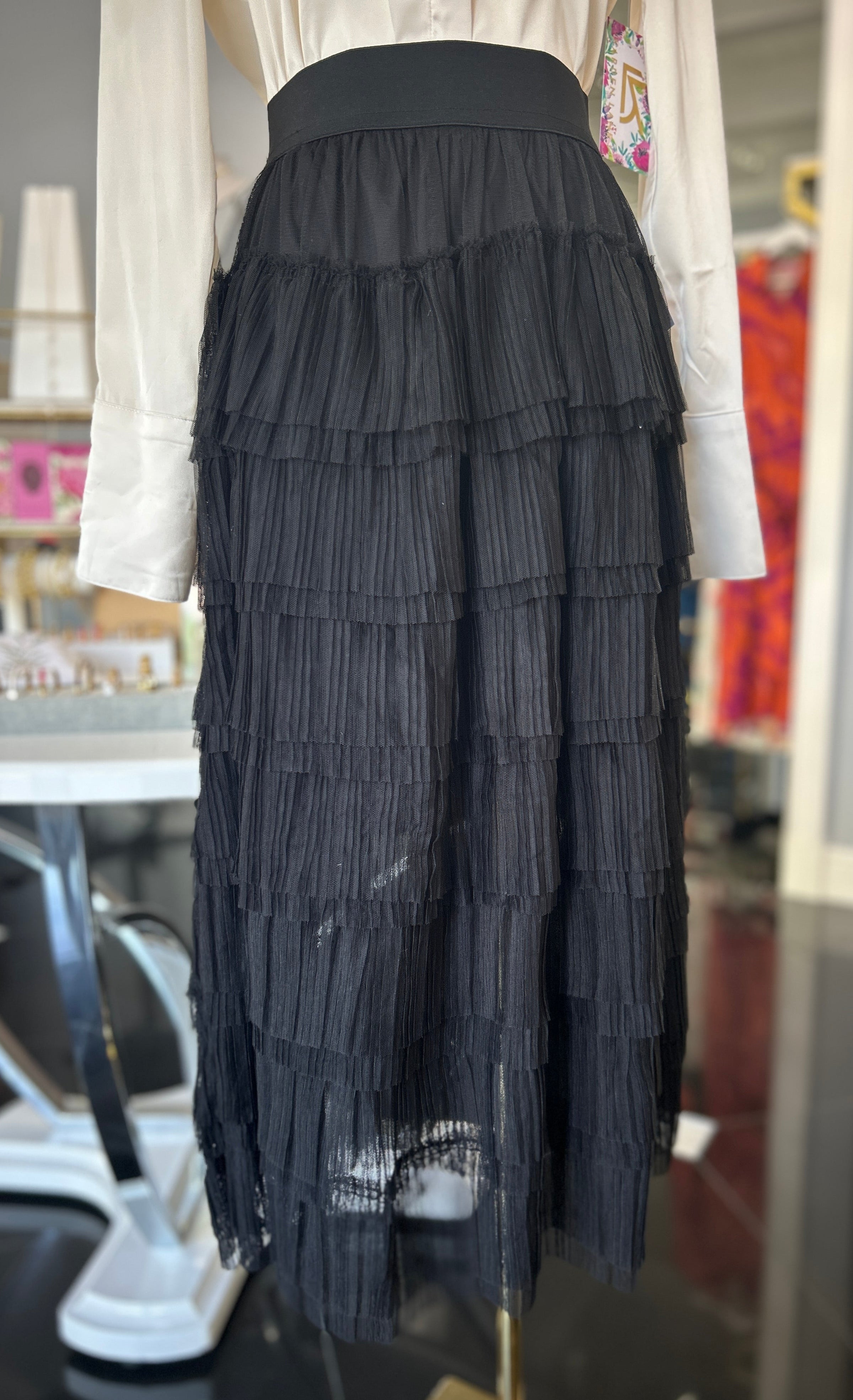This black midi skirt features a charming tiered tulle ruffle overlay that adds movement and flair to your fall and holiday looks. Its playful layers create a whimsical silhouette, perfect for festive gatherings or cozy autumn days. Pair it with your favorite sweater or blouse to dance through the season in style.