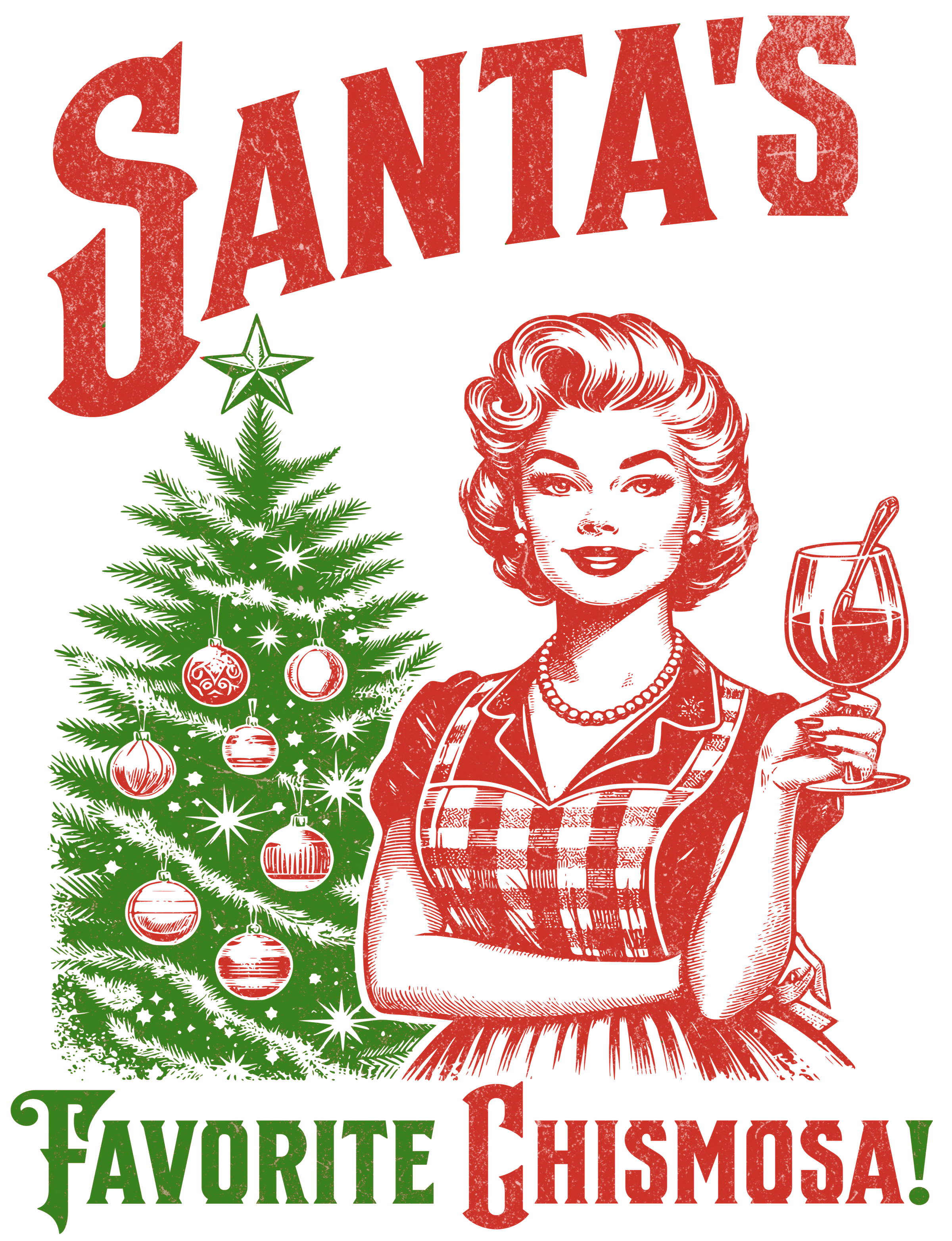 Celebrate the holidays with a laugh in this playful white graphic tee featuring "Santa's Favorite Chismosa!" paired with a festive Christmas tree and a woman enjoying her spritz. Perfect for anyone who loves holiday humor and isn't afraid to embrace their inner gossip queen. Soft, comfortable, and guaranteed to be a conversation starter at every seasonal gathering.