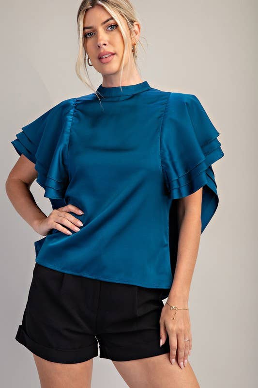 Elevate your holiday wardrobe with this stunning satin top featuring playful ruffle sleeves that add movement and charm to every outfit. The mock neck keeps things polished while the chic keyhole cutout and self-covered button back detail bring unexpected sophistication. Perfect for festive gatherings, date nights, or whenever you want to feel effortlessly elegant and a little bit fabulous.