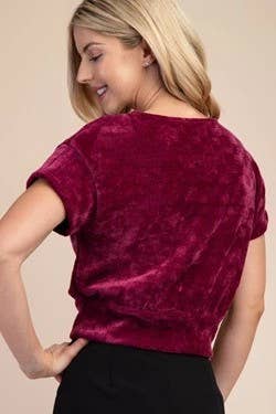 Elevate your holiday looks with this plush velvet crop top in rich plum. The textured knit fabric feels as luxe as it looks, while the cropped silhouette and round neckline create a flattering, modern vibe. Perfect for festive gatherings, date nights, or whenever you want to add a touch of velvet glamour to your wardrobe. Pair it with your favorite bottoms for instant sophistication with a playful twist.